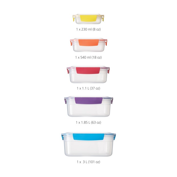 - Nest Lock set sadrži pet posuda različitih veličina i boja poklopaca koji se slažu sa bojama na samim posudama radi lakšeg uparivanja, a inovativan dizajn koji štedi prostor omogućava da posude držite jednu u drugoj.